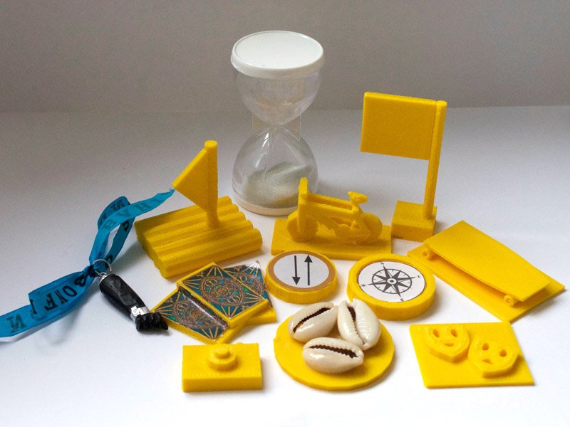 As fichas de desafios complementam o tabuleiro, cada ficha indica uma categoria de item que está ligado que a um desafio específico.
